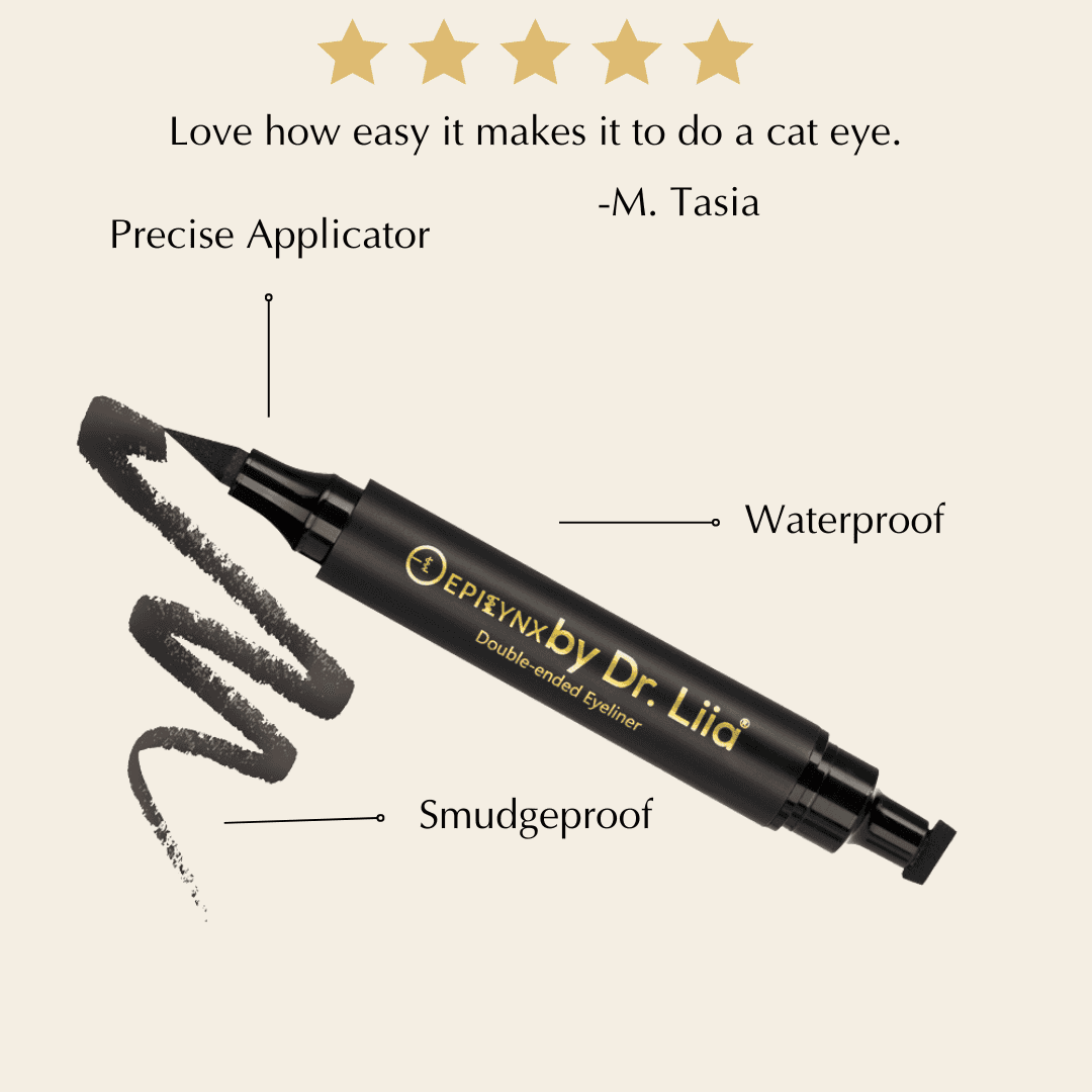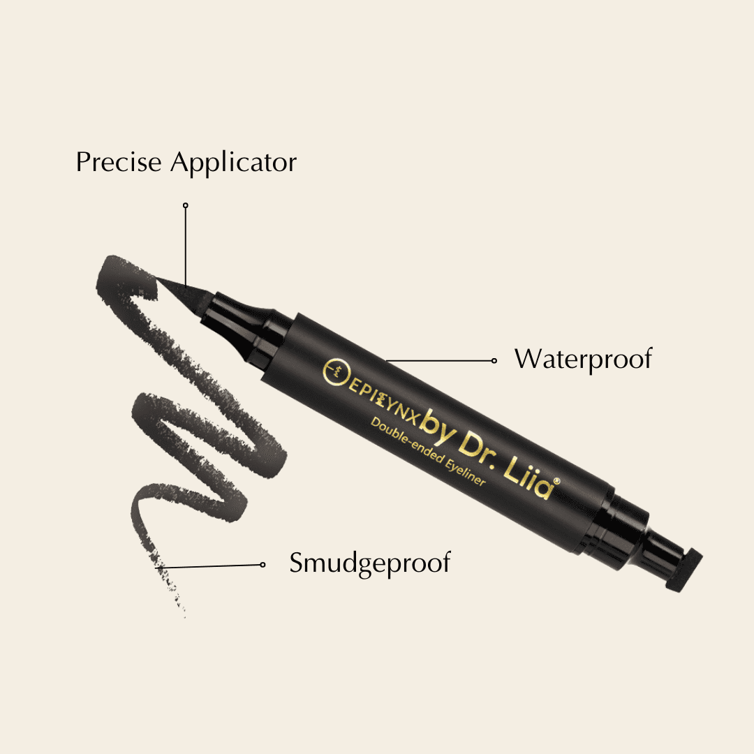Double Ended Liquid Eyeliner with waterproof, smudge-proof formula in five vibrant shades—black, brown, blue, green, and purple. Features a precise applicator tip for detailed application and a built-in wing stamp for effortless winged looks. Formulated gluten-free, vegan, and hypoallergenic for all skin types. Long-lasting wear keeps your eyes defined throughout the day.